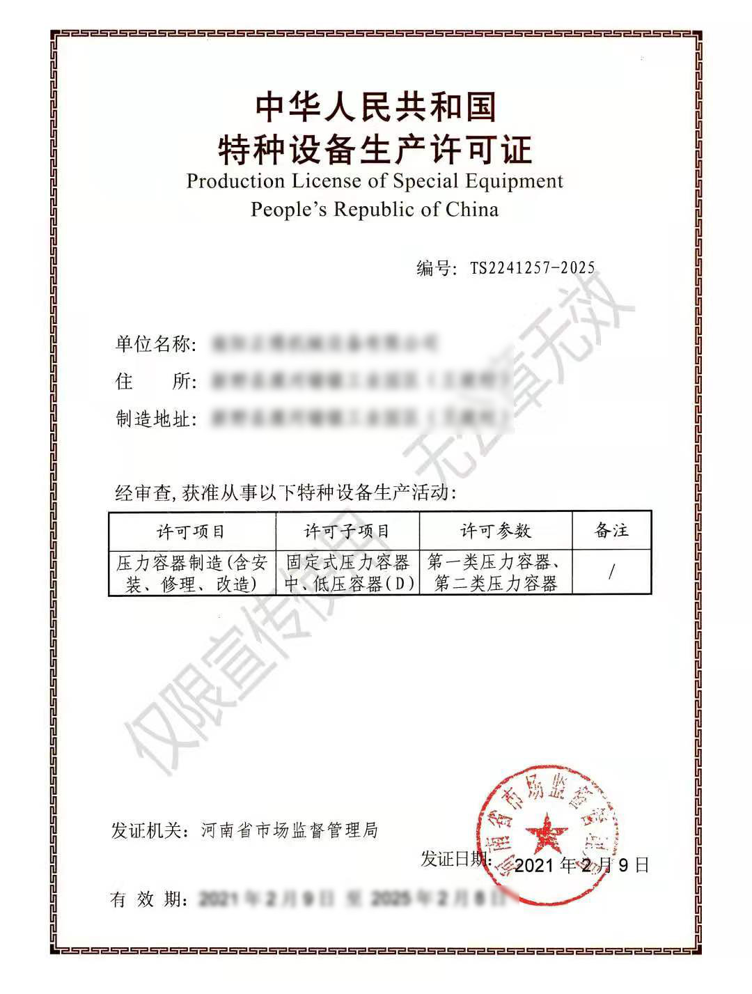 特種設(shè)備生產(chǎn)許可證