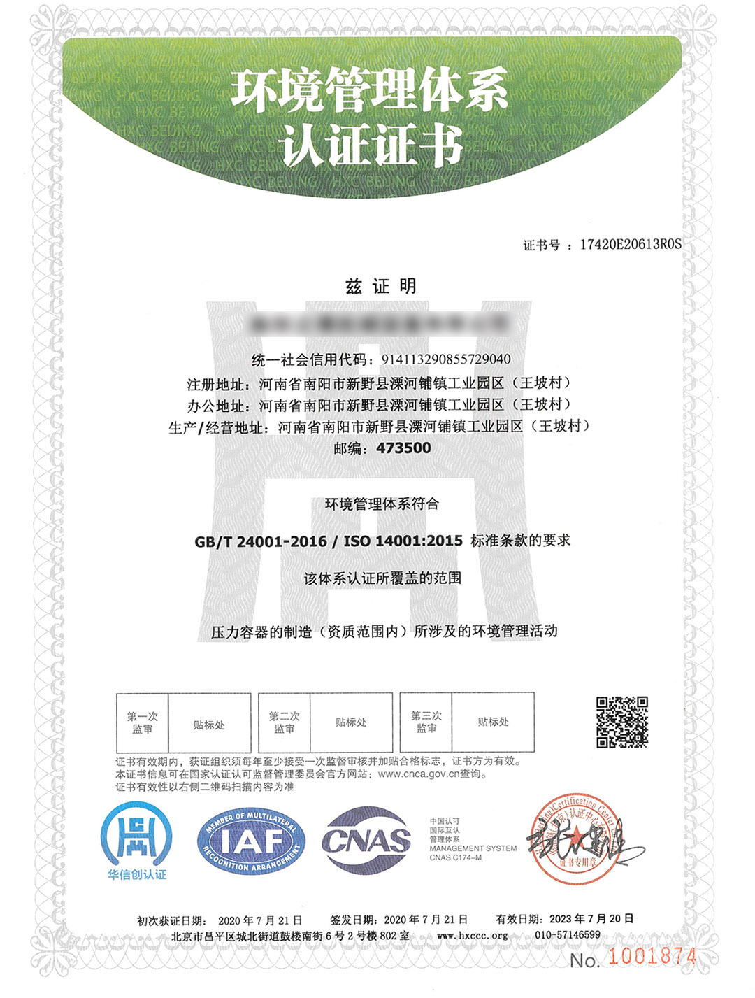 環(huán)境體系認(rèn)證證書
